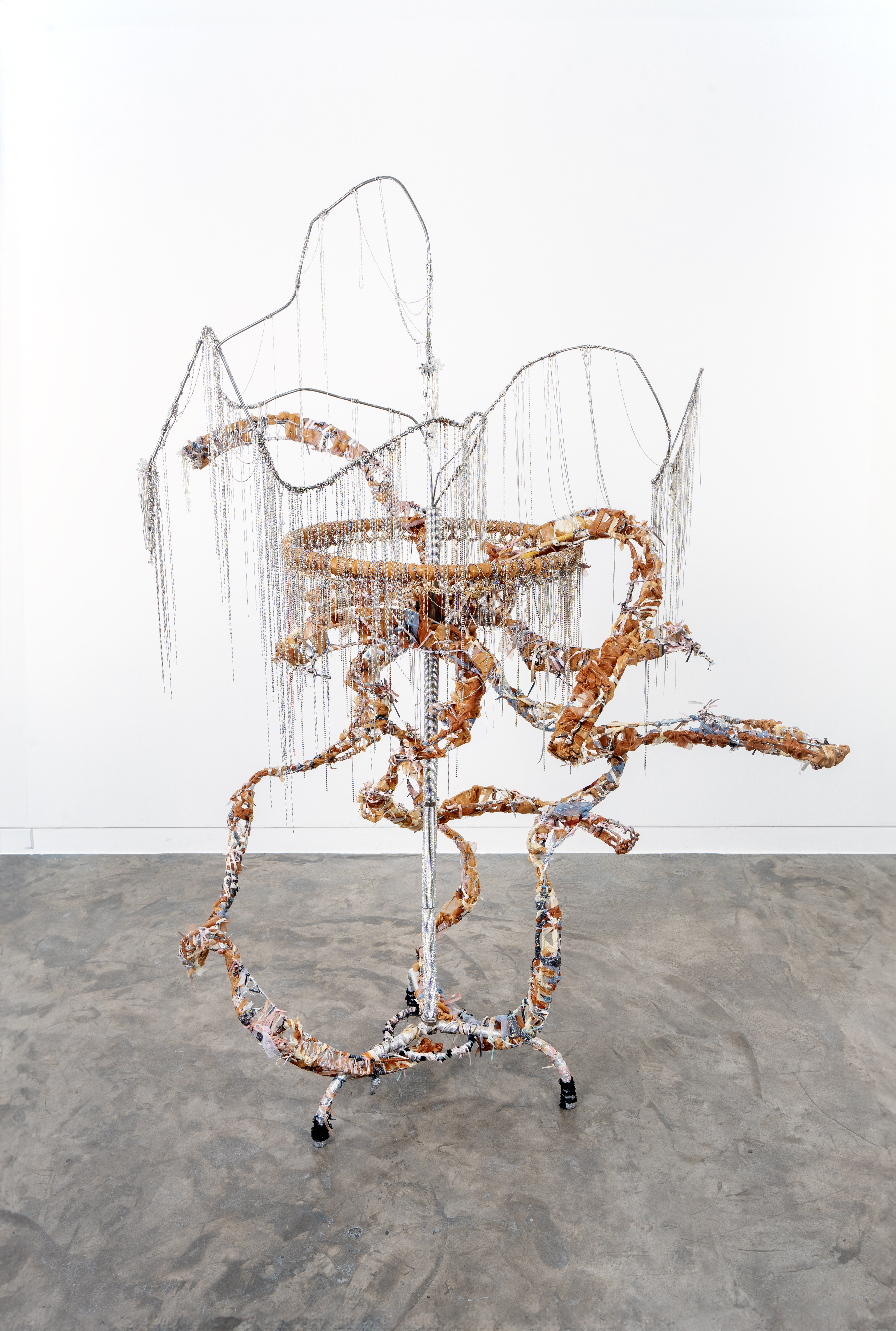 Electrical wires, in Chandelier, are ripped out from behind the walls. Bound in gradations of metallic ribbon and dressed with bead chains at the tip, these tentacular current-conduits no longer facilitate light but imply light itself. Branching out from one another rather than a core source, the cables of Chandelier snake and curl, endlessly passing on power from the mechanic’s drill to the smoothie shop’s blender to the welder’s fan. The ability to make a meagre source of electricity go on and on, infinitely, through looping extensions, flies in the face of the scarcity principle. On the streets, strategies of making-it-work make magic making energy.
