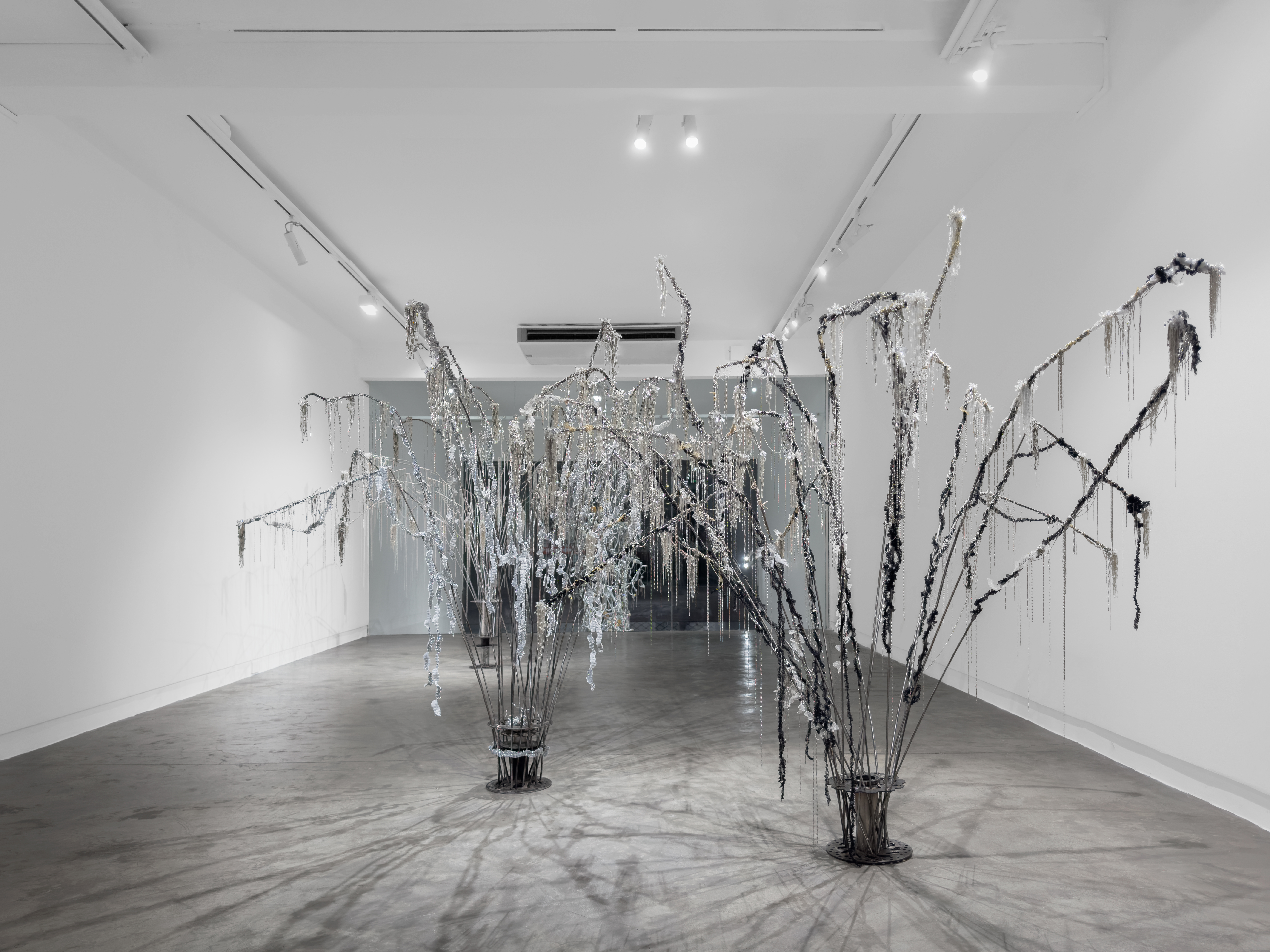 Creeping, coiling, crawling, droop. Whip-wires (or spinal cords) pierce through or are conjured and thrown to the ceiling where they stretch and contract space, until the stretching and contracting render vivid elasticity. Shooting out from armatures, Vy Trịnh’s sculptures reach for the edge of their dimensional confines until their pressing at the limits turns rigid planes to clingfilm. It is on these pliant planes, rather than hard tarmac, that the driver weaves her motorbike through the streets, orientating and disorientating herself among the signs and wares that blur and bounce across the field of refracting vision. To see, better not to focus.In the works of Vy Trịnh, the streets are not just pass-throughs but a site that borrows and creates materials, making methodologies, and sculpture itself through the bundling and stacking of commodities that spill out of shop fronts to flood pavements. If the Dadaists revelled at an upturned bicycle wheel stuck to a stool because *novelty*, the Vietnamese shopkeeper has long arranged her wares in absurd combinations and appropriated objects for use and misuse out of creative necessity. With the same urgency and do-I-give-a-damn?-ism, Trịnh uses highly manufactured materials and objects not as “readymades”, but bootlegs them as raw materials: she grinds, bends, wraps, ties, burnishes, and adds bling.