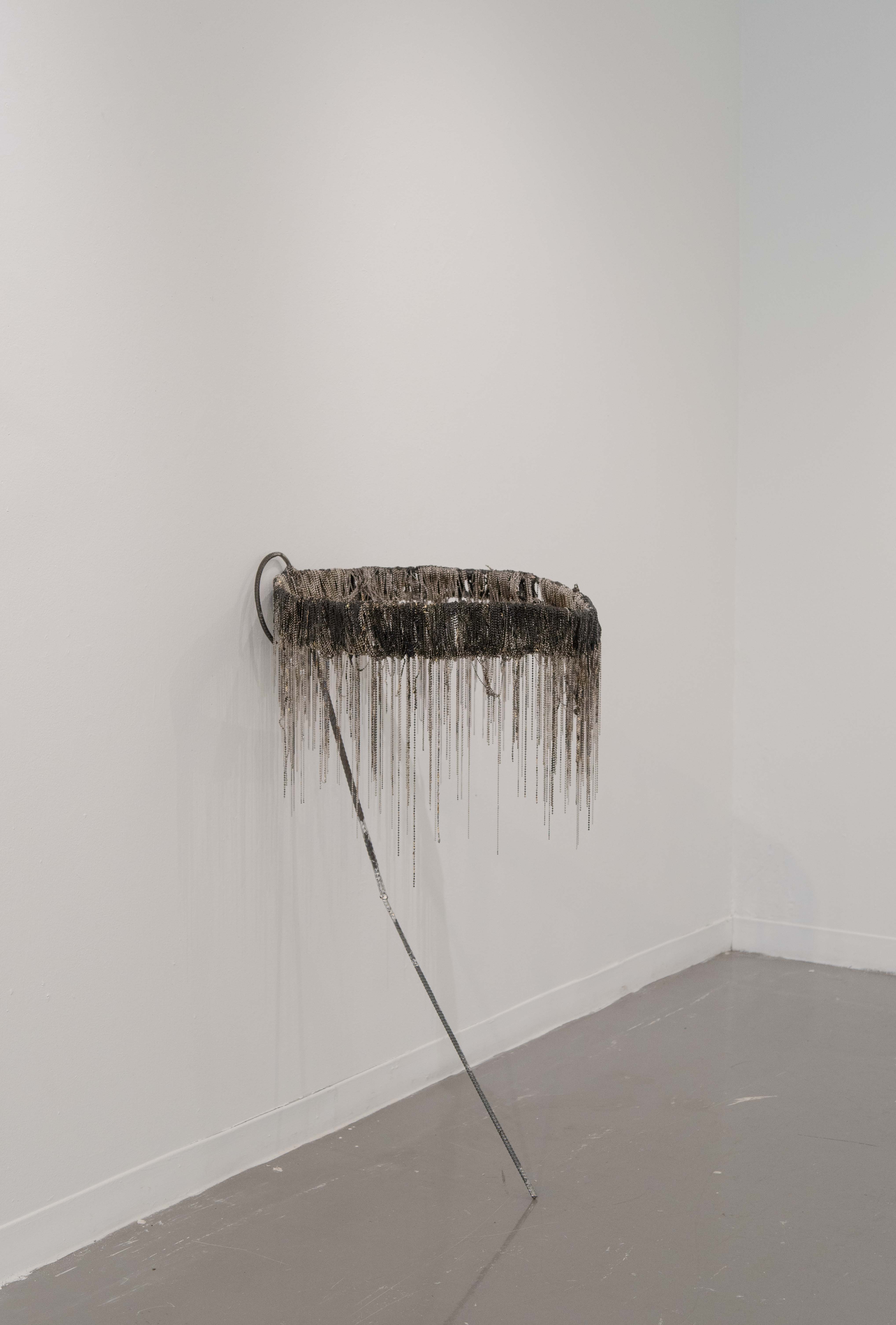 Space, steel, rebar, brass, flux, nickel-plated steel ball chain, light bulbs, LED lights, aluminium U-channel bar, silicon strip, hardware, tape, acrylic, and electricity.