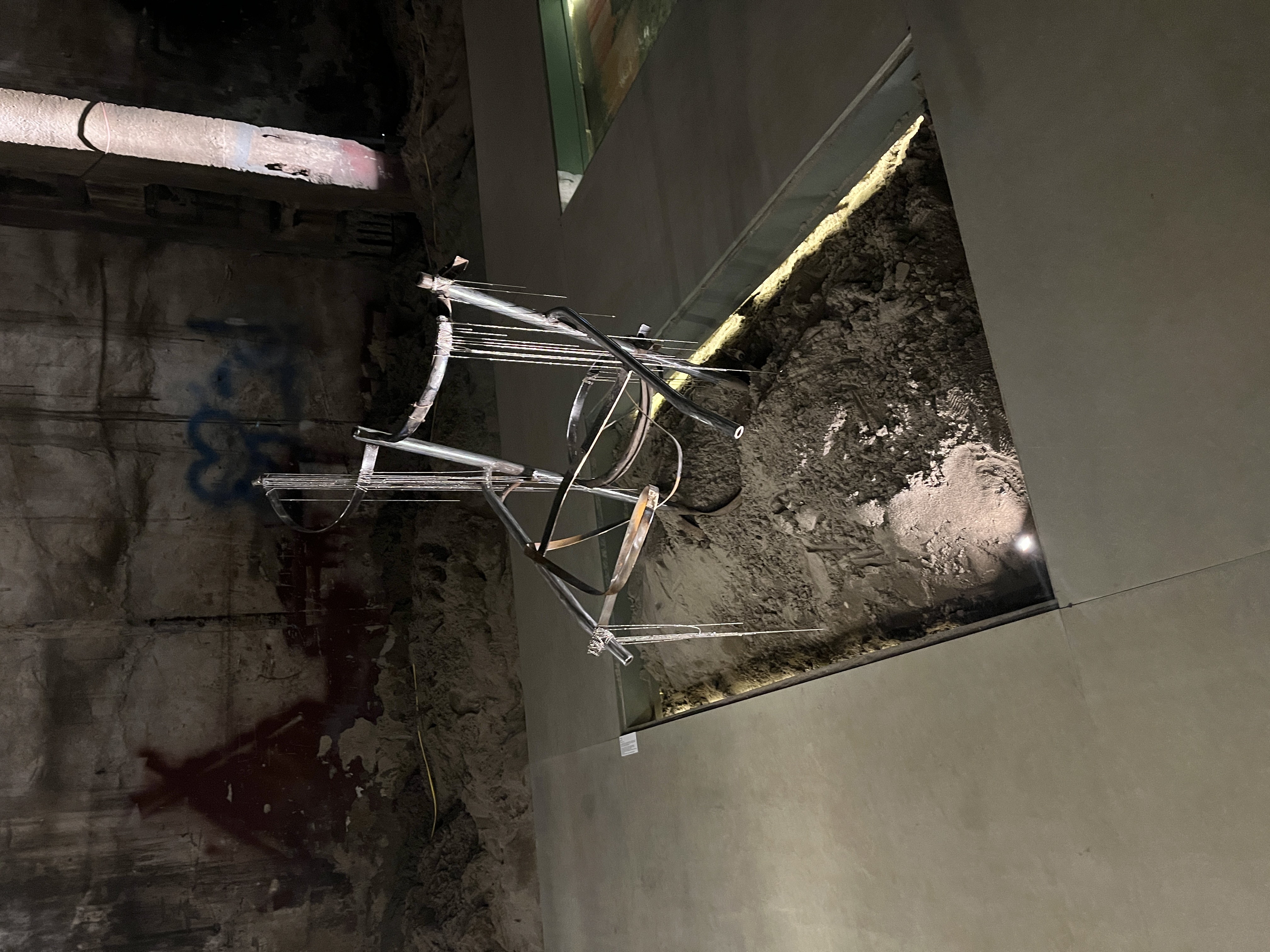 Space, steel, rebar, brass, flux, nickel-plated steel ball chain, light bulbs, LED lights, aluminium U-channel bar, silicon strip, hardware, tape, acrylic, and electricity.